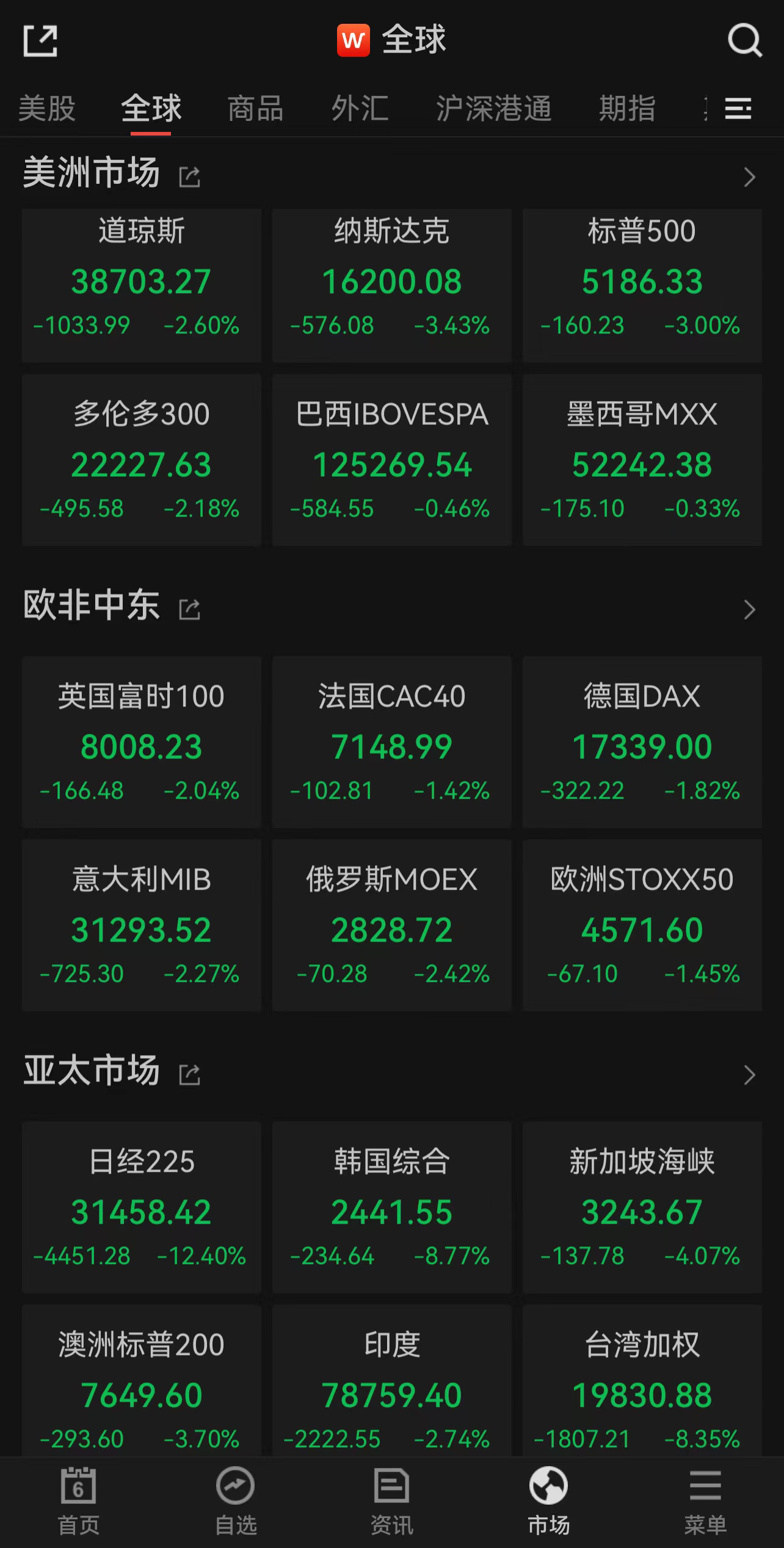 美国科技股延续**趋势,苹果下跌4.82%,谷歌下跌4.45%,亚马逊下跌4.10%,微软下跌3.27%,Meta下跌2.54%,奈飞下跌2.46%。