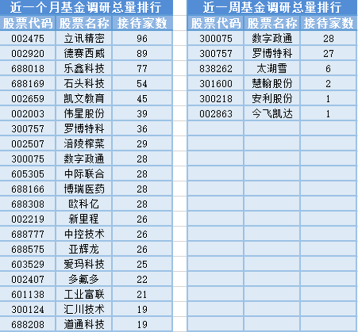 将时间周期缩短到最近一周(10月2日-10月9日)来看,基金调研数量**的公司是数字政通,属于软件与信息技术服务业,主营业务为专业智慧城市应用软件的开发和销售;共被28家基金机构调研;然后被调研数量较多的股票是罗博特科、太湖雪和慧翰股份,分别接受27家、6家和2家基金机构的调研。