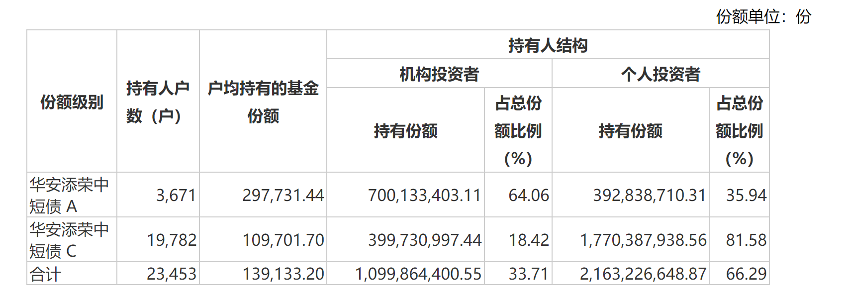 根据基金中报显示,华安添荣中短债机构持有者占比33.71%,个人投资者占比66.29%,持有人户数约2.35万户。