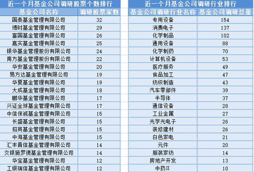 近一个月(9月16日-10月15日),国泰基金参与公司调研的数量最多,共调研32家上市公司,然后调研较为活跃的还有博时基金、富国基金和嘉实基金,分别调研29家、26家、25家上市公司;从调研行业上来看,基金公司对专用设备行业的上市公司调研次数最多,共有154次,其次是消费电子行业,基金公司调研了137次。