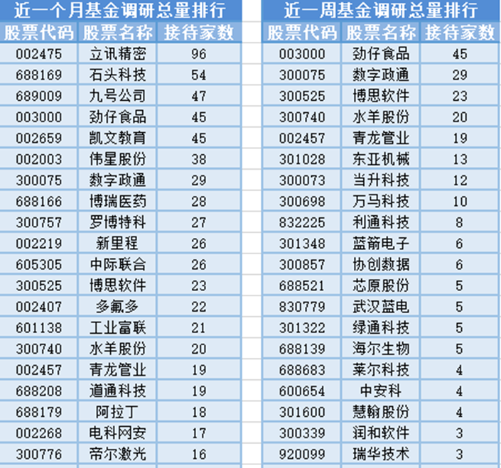 将时间周期缩短到最近一周(10月8日-10月15日)来看,基金调研数量**的公司是劲仔食品,属于休闲卤制品、休闲鱼制品、休闲豆制品、休闲肉制品行业,主营业务为风味休闲食品的研发、生产和销售;共被45家基金机构调研;然后被调研数量较多的股票是数字政通、博思软件和水羊股份,分别接受29家、23家和20家基金机构的调研。