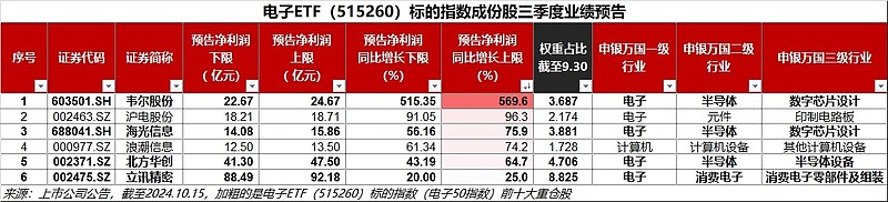 基本面上,截至10月15日,电子ETF(515260)标的指数(电子50指数)50只成份股中,已有6家上市公司发布三季度业绩预告,其中韦尔股份预计净利同比暴增5倍;沪电股份、海光信息、浪潮信息、北方华创、立讯精密预计净利实现两位数增长!