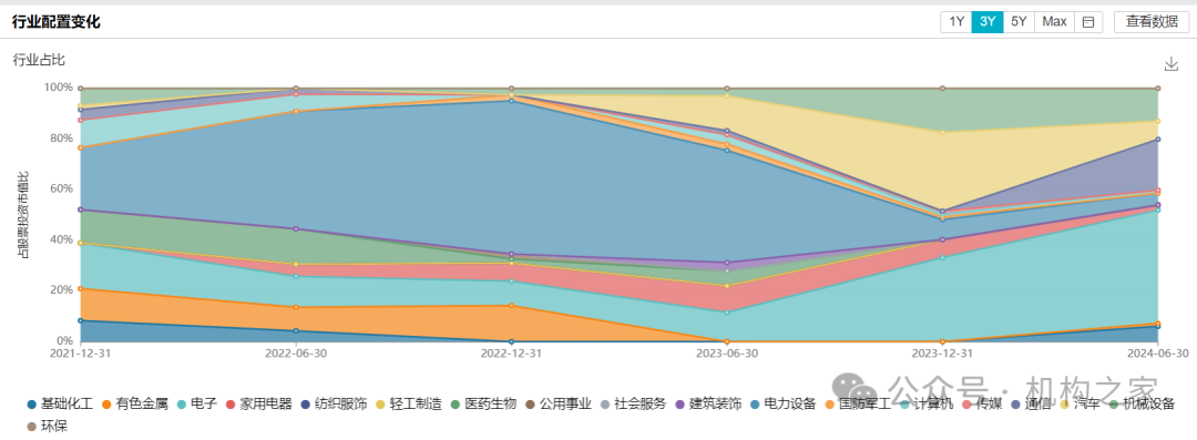 该基金在2021-2023年间**大行业配置是电力设备行业,在2022年第四季度该基金电力设备行业持仓高达60.44%,而当年新能源行业大幅下跌,该基金也亏损-32.61%。此后该基金止损了新能源行业的配置,在今年二季度**大行业配置变成电子行业,占比同样高达44.72%。结合其中报披露的重仓持股来看,电子行业的持仓实际是高位接盘了人工智能相关标的,如:中际旭创、天孚通信、新易盛、沪电股份、胜宏科技等,前十大持仓属于同一产业链上标的,股价走势趋同。