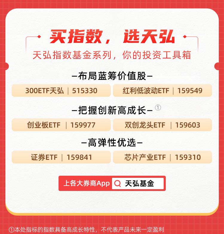 对于新手或者更希望求稳一些的投资者,则可以布局蓝筹价值方向,比如代表A股优质大蓝筹公司的基本款宽基指数沪深300(天弘沪深300ETF联接基金(A类:000961;C类:005918),场内为300ETF天弘(515330)),以及代表红利风格、同时添加低波动因子,预计未来将持续受益于价值风格演绎的红利低波100指数(天弘红利低波100(A类:008114;C:008115),场内为红利低波动ETF(159549)),这类风格历史长期表现较优,是长期布局的好选择。以上场外产品上支付宝搜“天弘基金”即可查看,场内产品可上各大券商APP 搜产品代码即可。