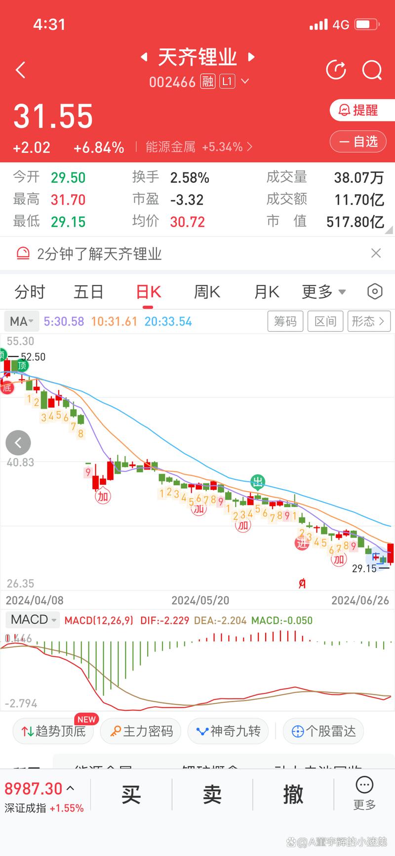 对于股价突然跌停,天齐锂业的股吧里也炸锅了,有投资者表示,天雷在顶,吃不消了,被套了。亿万股民朋友可能没想到,节后A股开盘就以跳水开市,一路下挫动荡,上午收盘,上证指数跌0.9%,深证成指跌0.87%,创业板指数跌0.69%,两市成交额6603亿元,个股更是惨烈,将近3000只下跌,1280只上涨,2968只下跌。到关键时候了,持有:东方财富,中芯**,天齐锂业。