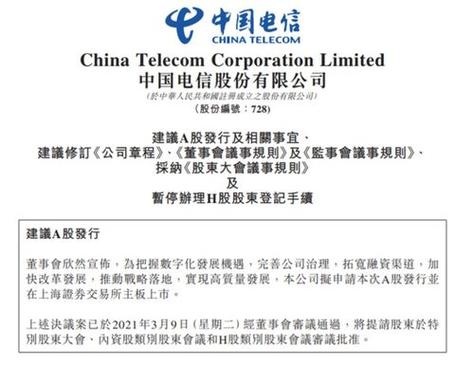 2、**电信什么时候在A股上市