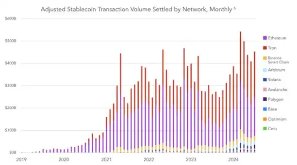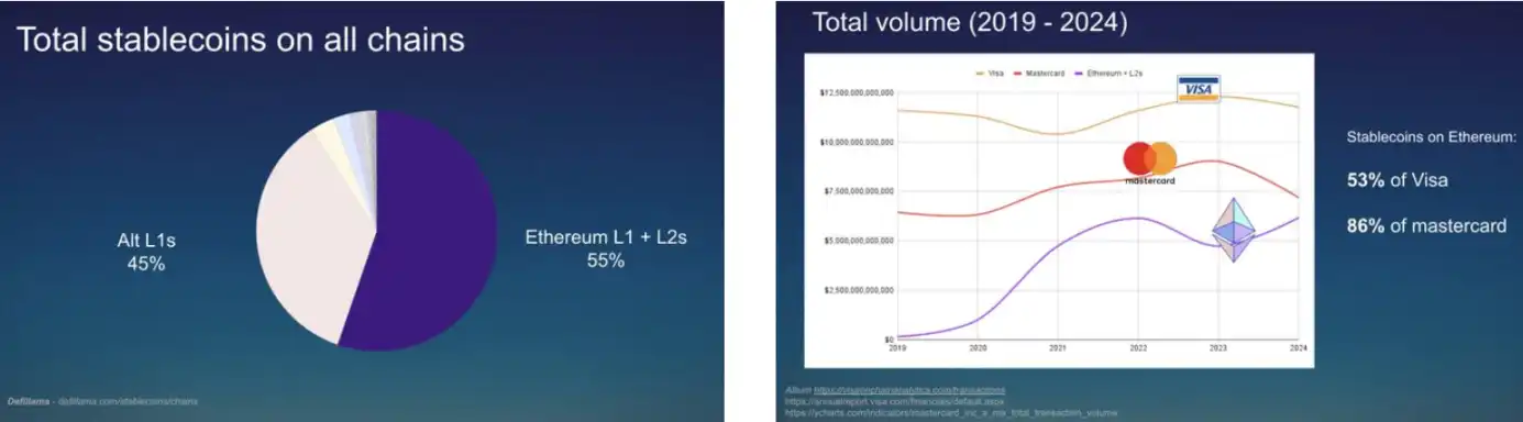 稳定币在许多链上都有,但以太坊生态系统作为大多数现有稳定币的流通场地而具有独特的作用。而以太坊生态系统中的稳定币数量现在可与包括万事达卡和 Visa 在内的主要支付处理网络竞争。