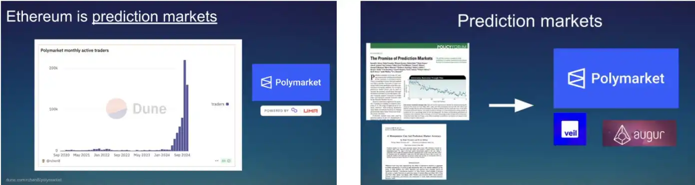 预测市场的巨大突破性成功,例如 Polymarket 和 Polygon 团队正在向世界展示构建链上开放系统的可能性。我对 Polygon PoS 很快完成向以太坊验证的过渡感到非常兴奋。我喜欢以太坊生态系统的一点便是,以太坊是让创意进入生产的地方。预测市场是一个想法,几十年来在学术工作中得到了形式化和辩论。正是在以太坊上,早期的实验带来了突破性成功的时刻。