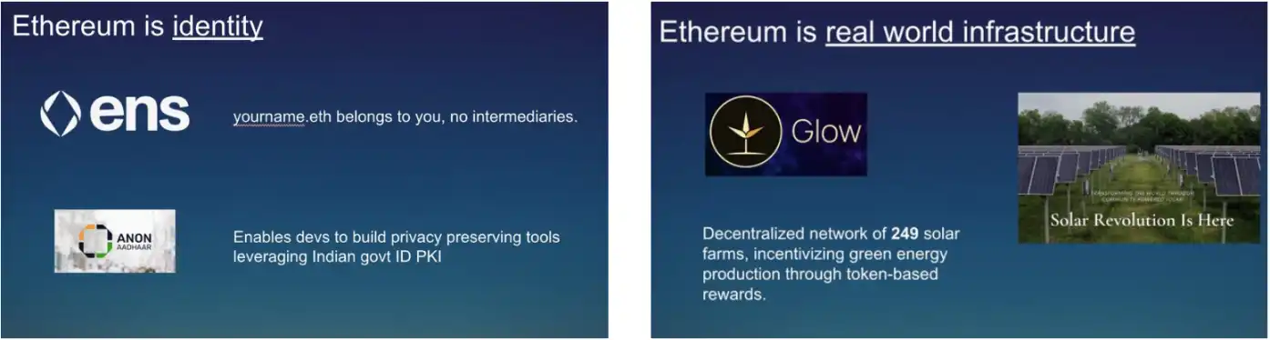 去**化身份系统,例如 ENS 和 AnonAadhaar 等为用户提供了**化或传统 ID 所不具备的选项。现实世界的基础设施,如 Glow 利用以太坊生态系统来激励数百个太阳能发电厂。