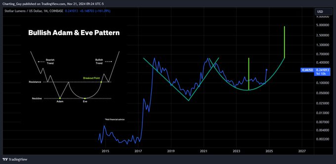 据分析师称,自 2017 年以来, XLM 价格在月度图表上形成了看涨的“亚当和夏娃”模式。这种图表模式通常与长期上涨势头相关。