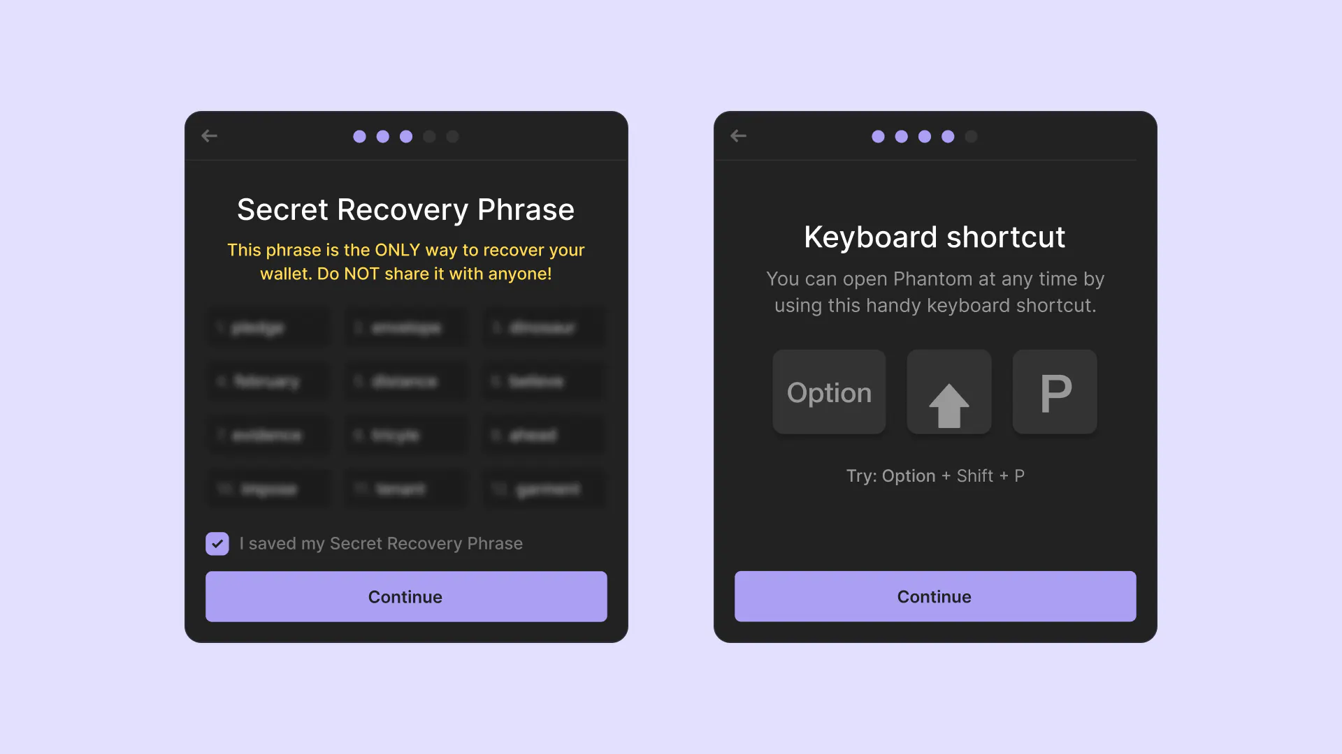 幻影种子短语步骤5:保存您的钱包密码并保护您的秘密恢复短语后,选择“继续”。