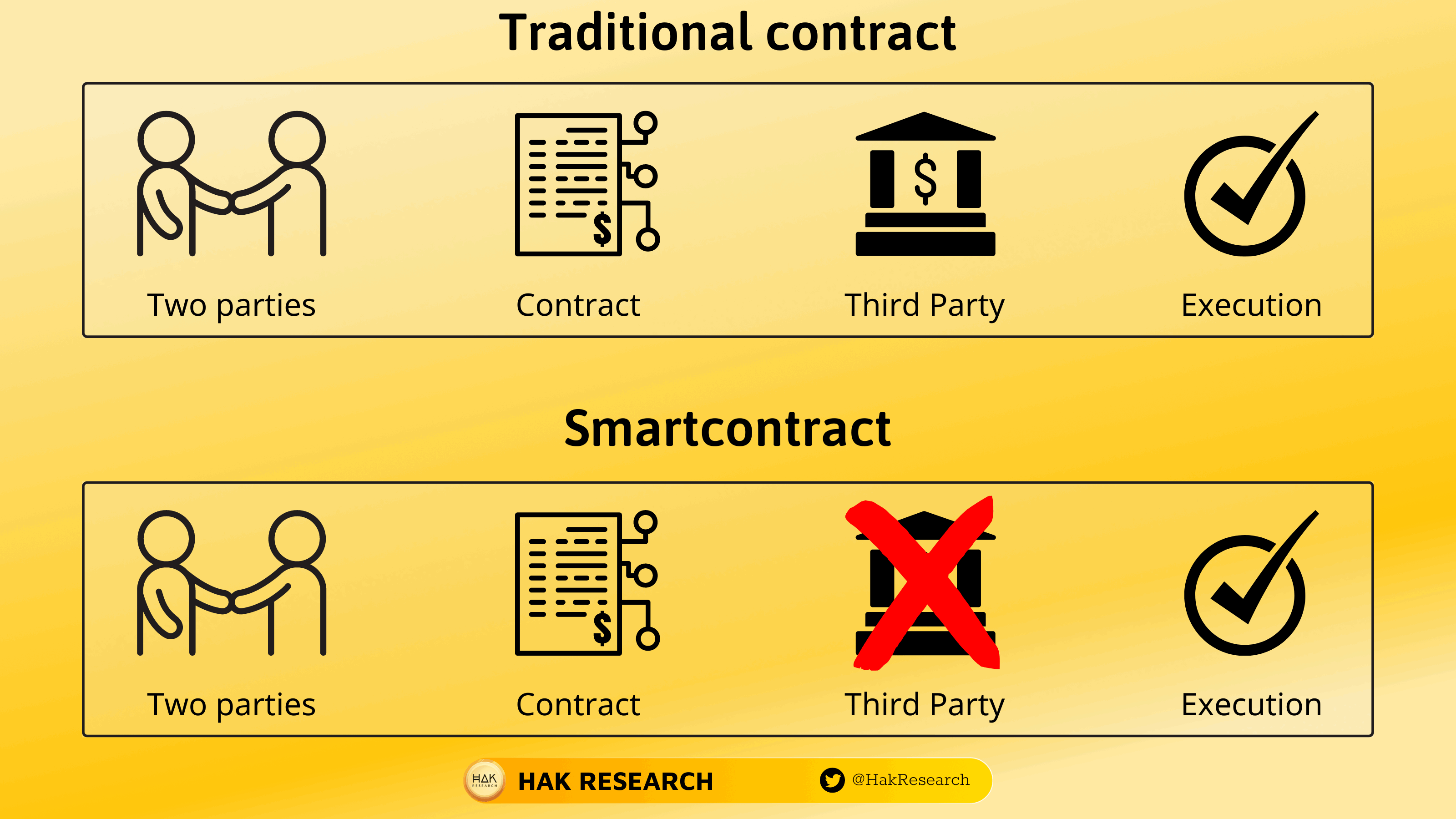 当智能合约还没有像今天这样广泛应用时,两个或两个以上的交易方会创建一个合约,并需要第三方作为中介来确保交易的进行。