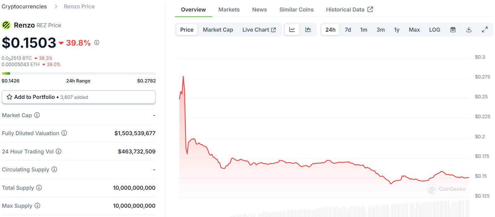 Renzo (REZ) 价格图表于 2024 年 5 月 1 日下午 01:00。来源:CoinGecko