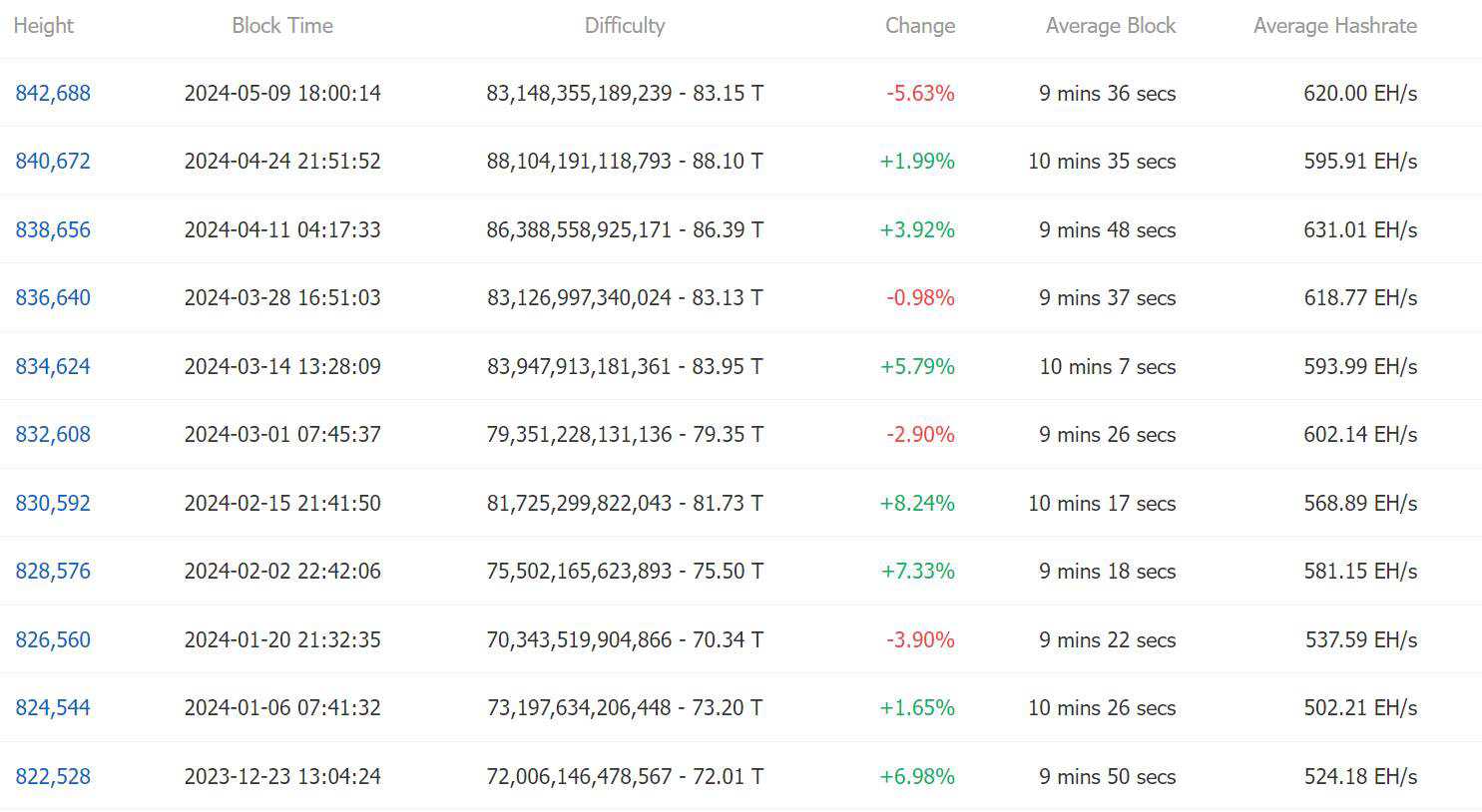 最近比特币挖矿难度调整的历史。来源:BTC.com(2024 年 5 月 10 日)