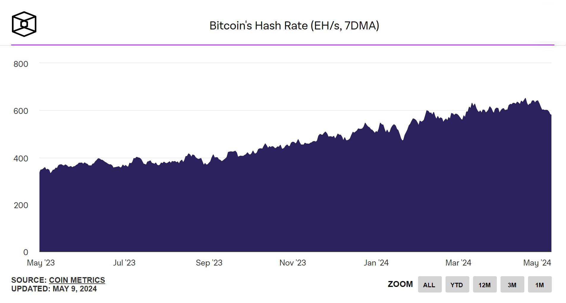 比特币网络的平均算力统计。来源:The Block(2024 年 5 月 10 日)