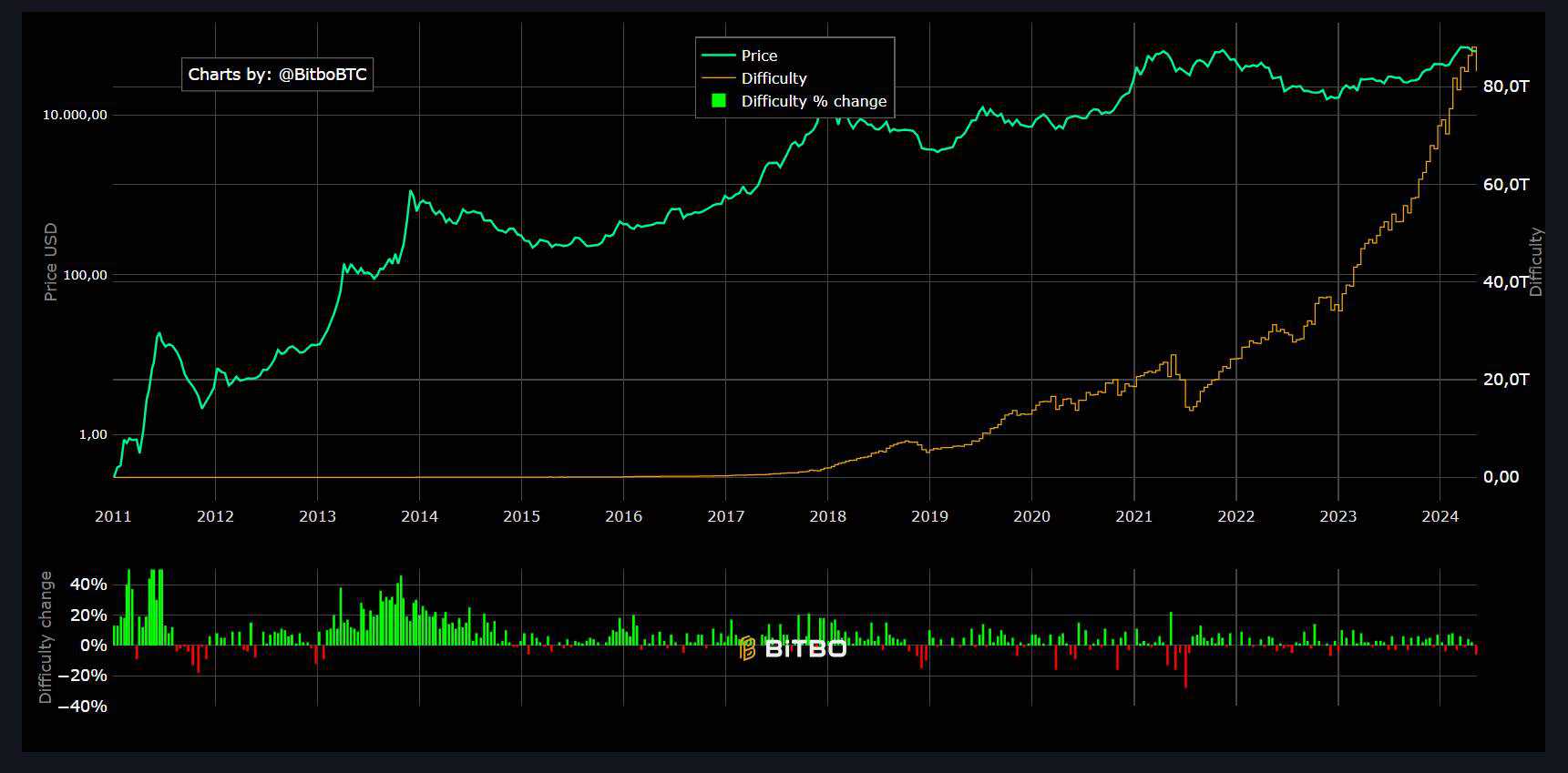 比特币价格波动(绿色)和比特币挖矿难度(橙色)统计。来源:Bitbo(2024年5月10日)