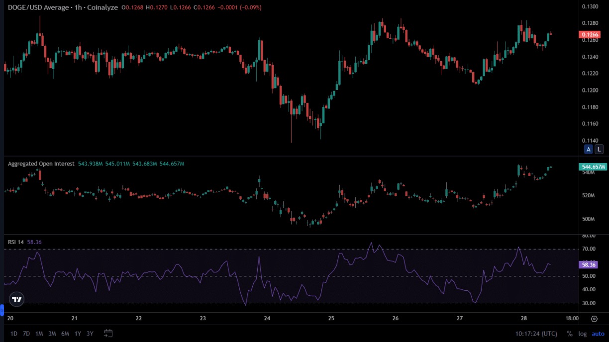 狗狗币的未平仓量大幅增长,过去 24 小时内飙升超过 5%,估值达到 5.449 亿美元。凭借这样的增长,它显示出进一步上涨的巨大可能性。这样的发展将增强人们对狗狗币上涨轨迹的信心,并可能带来持续增长。