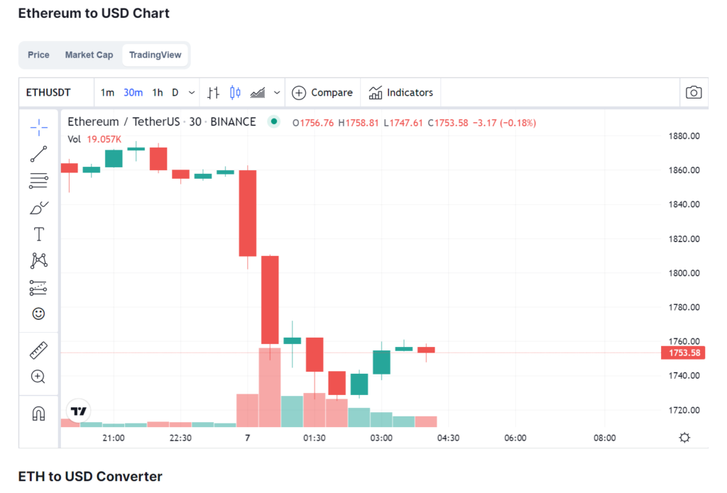 随着丽都出售以太坊的讨论,以太坊今天也崩盘了。从早上6点开始,从1872.46美元一直下跌到**1729.41美元,跌幅约为7.63%。截止日期后的暂定报价为1753.58美元。
