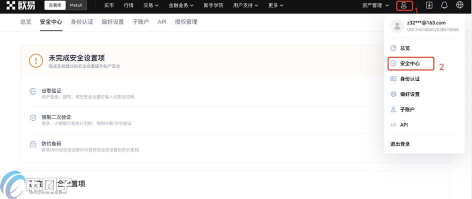 4.安全设置:打开欧易官网,在页面右上角点击【个人**】—【安全**】,即可进入安全设置页面,您可以在此页面进行登录密码和资金密码的修改以及邮箱验证、谷歌验证、防钓鱼码等设置,个人信息设置的越完善,越能够保障您的交易和账户安全。