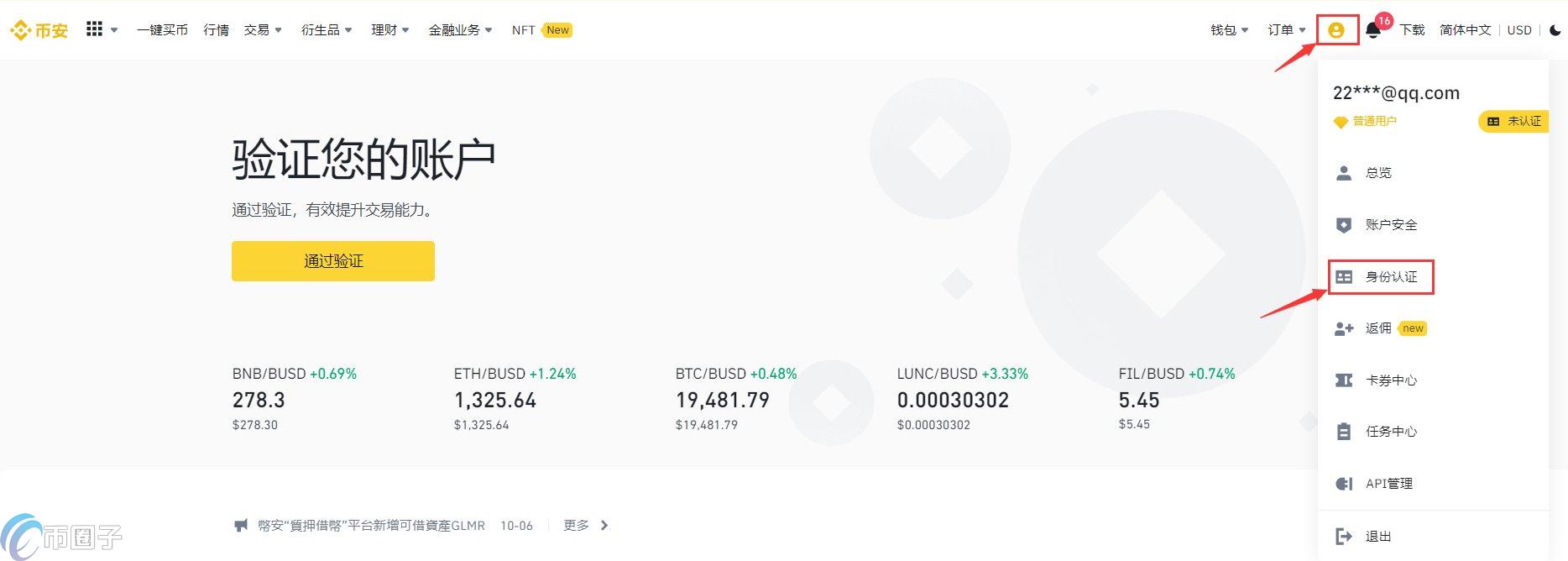 4.登录币安账户,在首页【用户**】--【身份认证】进行身份认证,在该页面可以查看当前认证级别,它决定了您的账户在币安的交易限额。如需提升额度,请依次完成各个级别的身份认证。