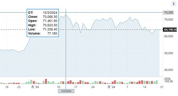 反观比特币,3月中旬其价格达到了创纪录的73798美元,占据加密货币市场近55%的市值份额,是2021年4月以来的**水平。
