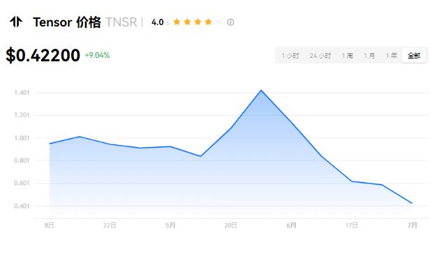 Tensor 当前价格为 $0.42200。Tensor 的价格在过去 24 小时内上涨了 9.04%。目前,Tensor 市值排名为第 205 名,实时市值为 $5,290.00万,流通供应量为 125,000,000 TNSR,**供应量为 1,000,000,000 TNSR。我们会实时更新 Tensor/USD 的价格。Tensor 价格表现 (美元)