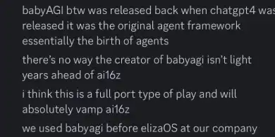事实上:「BabyAGI 是在 ChatGPT-4 发布时推出的,它是最早的智能体框架,可以说是智能体技术的起源。BabyAGI 的创造者无疑远远**于 AI16z。我认为 ElizaOS 的开发更像是一次**的框架移植,而且几乎可以肯定会**超越 AI16z。我们公司在使用 ElizaOS 之前就已经在内部使用过 BabyAGI。」