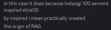 「在这种情况下,这种说法确实成立,因为 ElizaOS 的灵感**来源于 BabyAGI。这里的「灵感」几乎可以理解为,BabyAGI 实际上奠定了 RAG (Retrieval-Augmented Generation,检索增强生成) 技术的基础。」