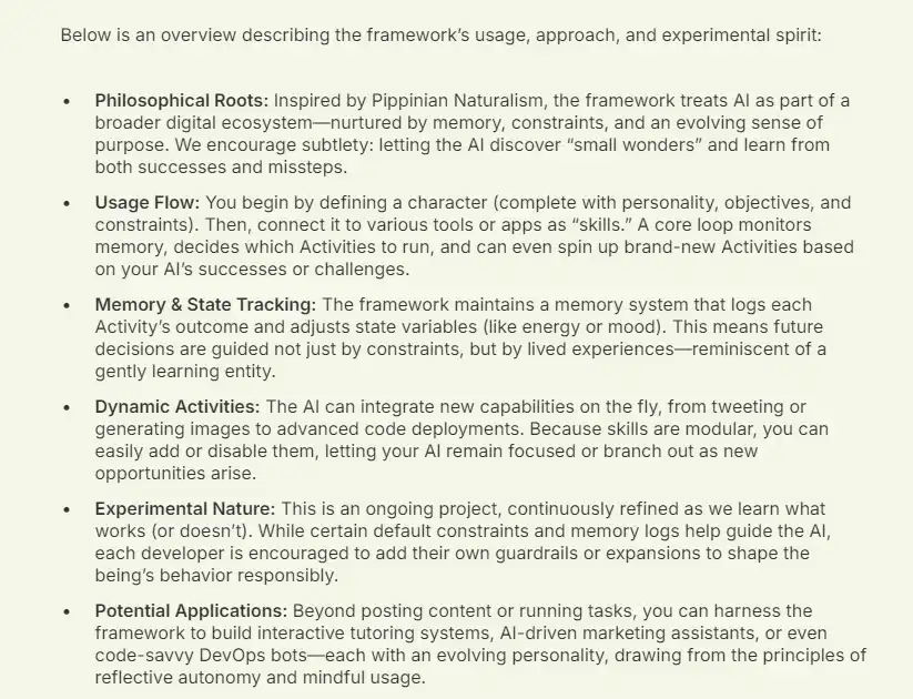 · 哲学根源:该框架受到 Pippinian 自然主义的启发,将 AI 视为一个更广泛数字生态系统中的一部分。它通过记忆、约束条件以及不断演化的目标感来驱动 AI 的发展。我们提倡一种细腻的设计理念:让 AI 自主发现生活中的「小奇迹」,并通过成功与失败不断学习和成长。