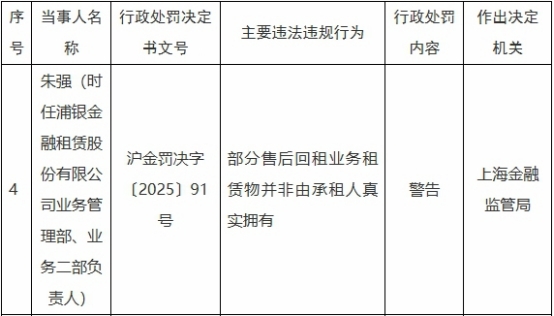 **经济网北京3月13日讯 **金融监督管理总局网站昨日公布的上海监管局行政处罚信息公开表(沪金罚决字〔2025〕91号)显示,时任浦银金融租赁股份有限公司业务管理部、业务二部负责人朱强为部分售后回租业务租赁物并非由承租人真实拥有的相关责任人。上海金融监管局对其警告。