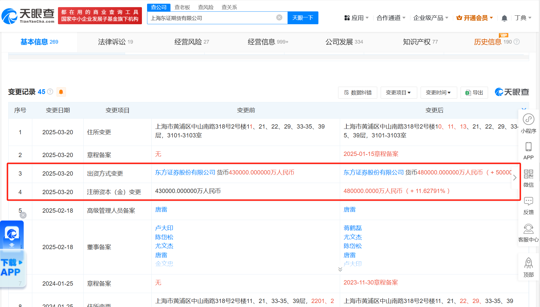 财经3月26日讯 近日,据天眼查披露,上海东证期货有限公司(简称“东证期货”发生工商变更,注册资本由43亿元人民币增至48亿元人民币,增加注册资本5亿元。