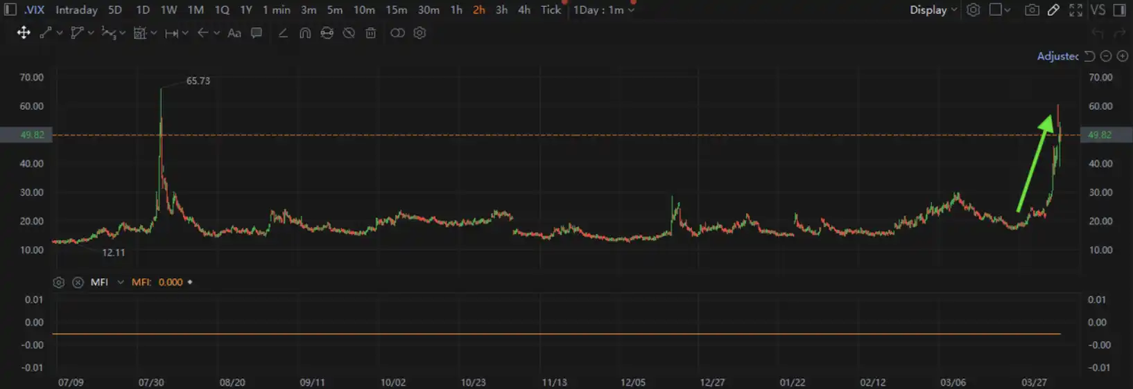 这场乌龙并非孤立事件。上周,特朗普宣布「世纪**贸易壁垒」后,标普 500 指数已较 2 月 19 日的历史高点下跌 20%,市值蒸发约 9.5 万亿美元,跌幅之快在 1945 年以来 14 次熊市中排名第二。华尔街恐慌指标——芝加哥期权交易所波动率指数(VIX),上周五收于 45 后,周一隔夜飙升至 60,远超 20 的长期均值,显示市场恐慌已达顶点。
