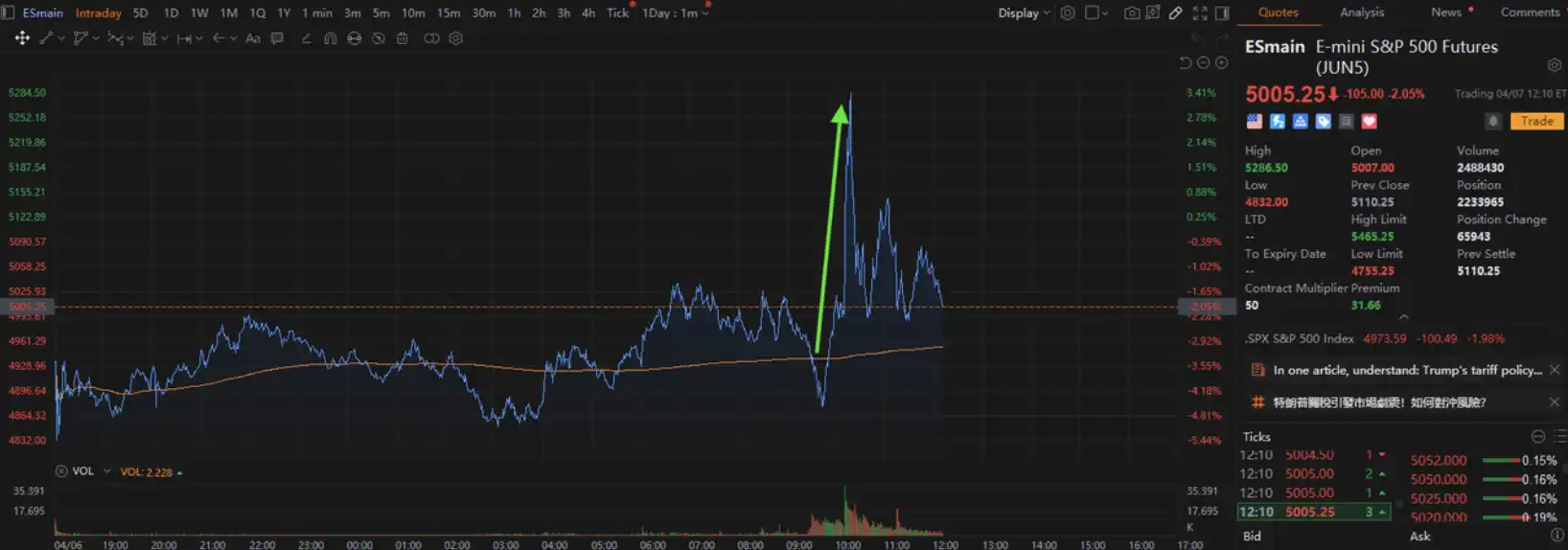 周一美股开盘,市场本已风雨飘摇。特朗普此前对主要贸易伙伴祭出的高关税壁垒,将标普 500 指数(SPY)推入自新冠疫情以来的**熊市。根据实时数据,标普 500 指数(SPY)当日开盘价为 489.19 美元,却在早盘一度跌至 483.122 美元的年内低点。然而,当「关税暂停」传言传出,10 点 15 分,SPY 飙升至 512.155 美元,市值激增。然而,澄清消息一出,到 10 点 45 分,SPY 回落至 504.19 美元,投资者眼睁睁看着万亿财富蒸发。