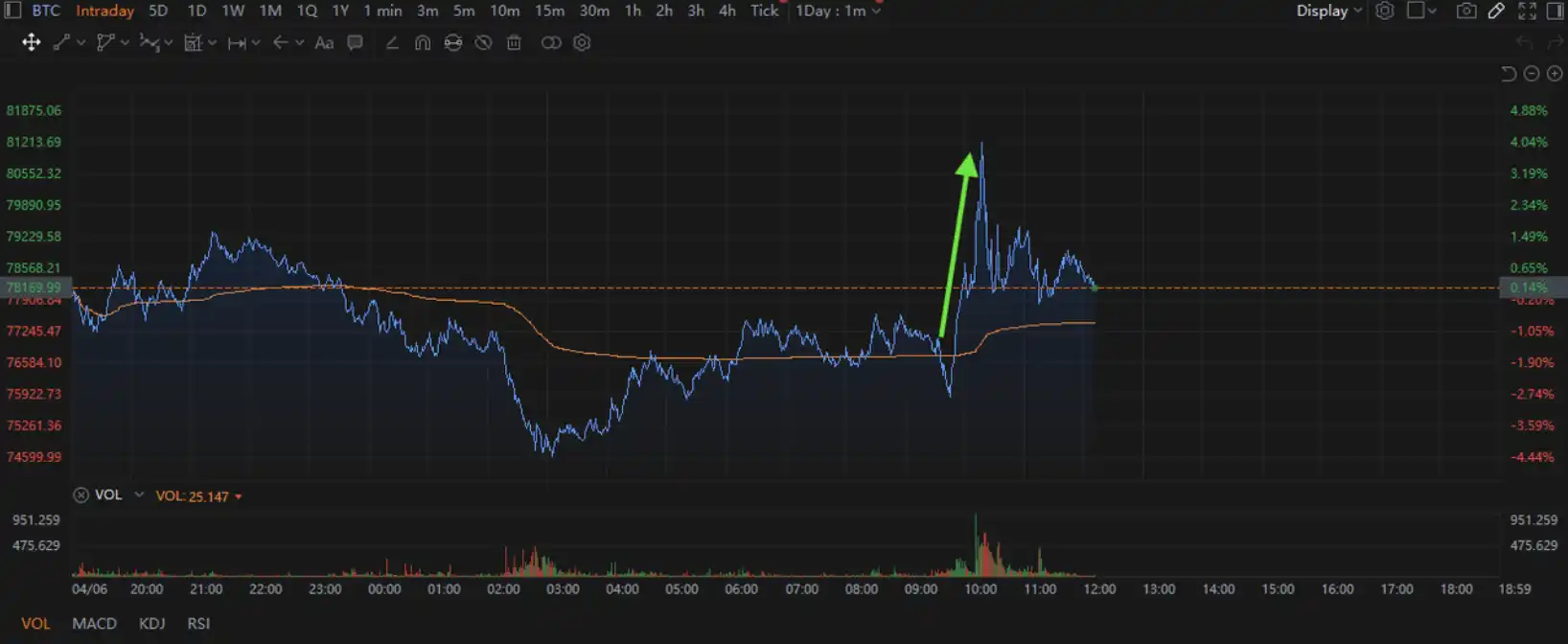 4 月 7 日,时间正值美国股市连跌三天的低迷时刻。美国东部时间上午 10 点 10 分,一条传言突然冒出:白宫正在考虑「暂停 90 天关税」。消息一出,市场瞬间躁动。仅仅 5 分钟后,10 点 15 分,CNBC 报道称,特朗普正考虑对除**以外的所有**实施为期 90 天的关税暂停。这一**性新闻让投资者热血沸腾。到了 10 点 18 分,标普 500 指数从低点飙升,市值暴增超过 3 万亿美元,市场仿佛嗅到了久违的牛市气息,投资者纷纷猜测这是特朗普政策转向的信号。同时,比特币从 76000 美元在短短 10 分钟时间内,上涨至 81000 美元。市场做多情绪非常一致,导致 1 小时内合约空单爆仓超 1.29 亿美金。