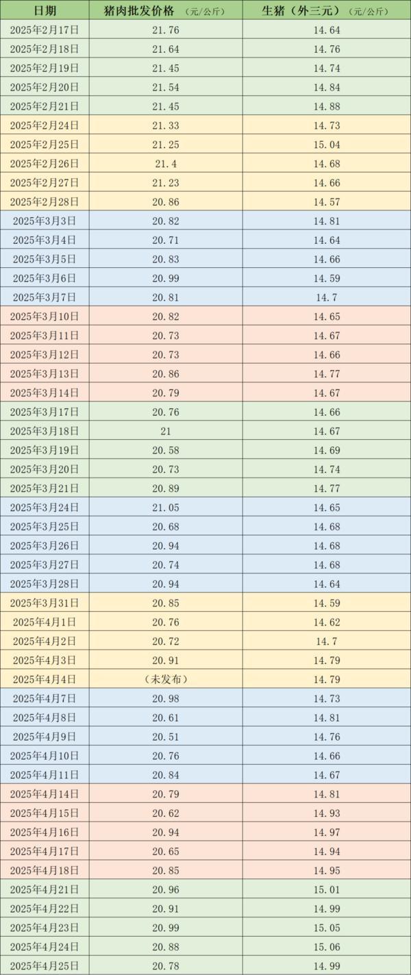 据农业农村部监测,4月25日,**农产品批发市场猪肉平均价格为20.78元/公斤,与上周五(4月18日的20.85元/公斤相比,下降0.3%。本周的平均价格为20.9元/公斤,与上周20.77元/公斤的均价相比,上涨0.6%。
