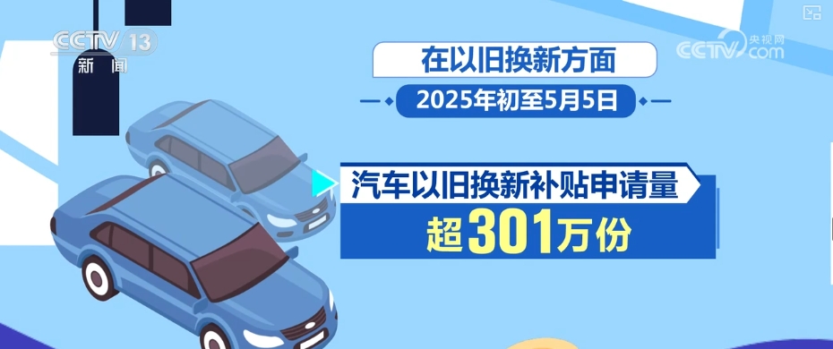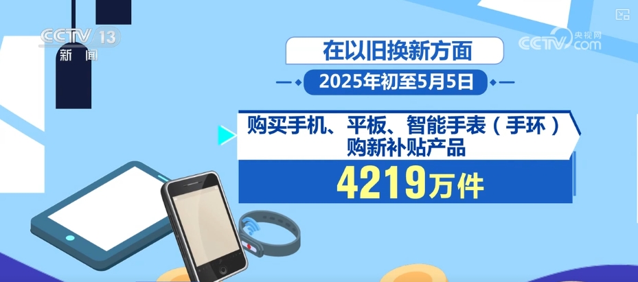 在以旧换新方面,2025年初至5月5日,汽车以旧换新补贴申请量超301万份;消费者购买12大类家电以旧换新产品5602万台,购买手机、平板、智能手表(手环购新补贴产品4219万件,电动自行车售旧、购新均超500万辆。