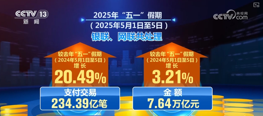**人民银行5月6日发布的数据显示,2025年“五一”假期,银联、网联共处理支付交易234.39亿笔、金额7.64万亿元,较2024年“五一”假期分别增长20.49%和3.21%。