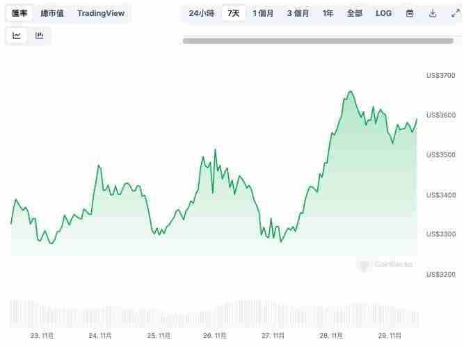 山寨币**以太坊(eth)近期展现出强势的市场动能,根据coingecko数据,以太坊($eth)在过去7 天内上涨了14%,成功突破3,500 美元的阻力位,并触及3,600 美元上方。