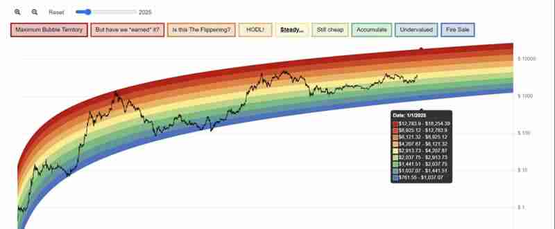 根据彩虹图的划分,以太坊的「**泡沫区域」落在12,783.90 美元至18,254.39 美元,此区域表示在市场情绪过于高涨且极端FOMO 的情况下,以太坊可能到达的价格水平。