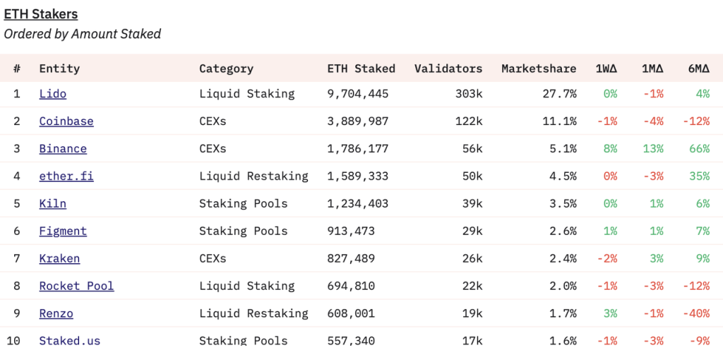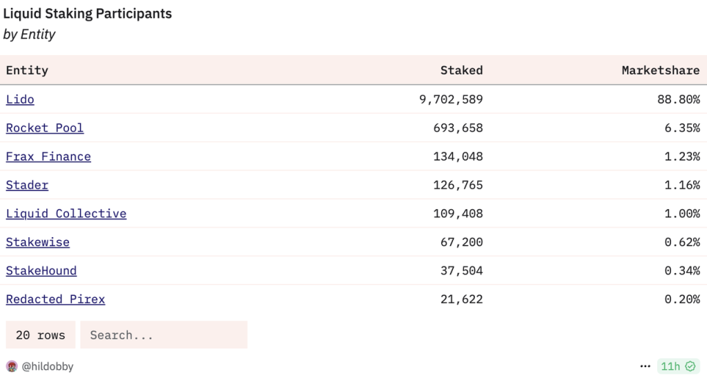 Liquid staking 参与者和市占率 来源:Dune登录后复制