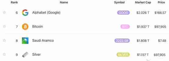 另外据8marketcap数据,比特币市值当前来到1.93兆美元,超过沙特**伯**石油公司(俗称沙特阿美)、以及白银市值1.73兆美元,跃升成为全球市值第7大资产,距离Google仅差不到100亿美元市值。