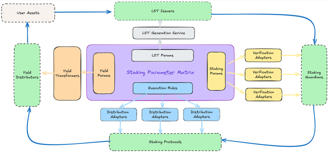 质押参数矩阵(SPM):抽象质押过程所需的核心参数,包括比特币脚本配置、质押交易参数、LST 合约参数以及收益分配规则,这些参数不仅在 SAL 各模块间共享,还支持参与质押流程的跨角色协作;
