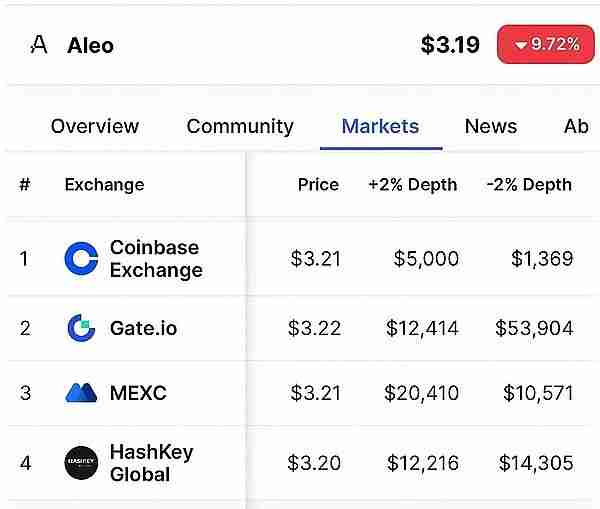从 Aleo 的**深度数据来看,各大交易所的买卖盘深度都非常薄弱。Coinbase 的 2% 买盘深度只有 $5,000,卖盘更是只有 $1,369,Gate.io 也是同样的情况,买盘撑不起卖盘的抛压。如此低的流动性,价格波动性自然极高,一旦有大额买卖单进场,价格就像坐过山车一样。
