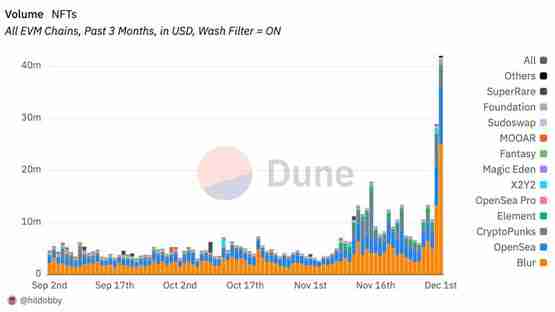 坠入寒冬已久的nft市场终于回温了?加密货币风投dragonfly数据总监@hildobby制作的dune图表显示,11月30日、12月1日连续两日的nft市场交易量显著飙升。