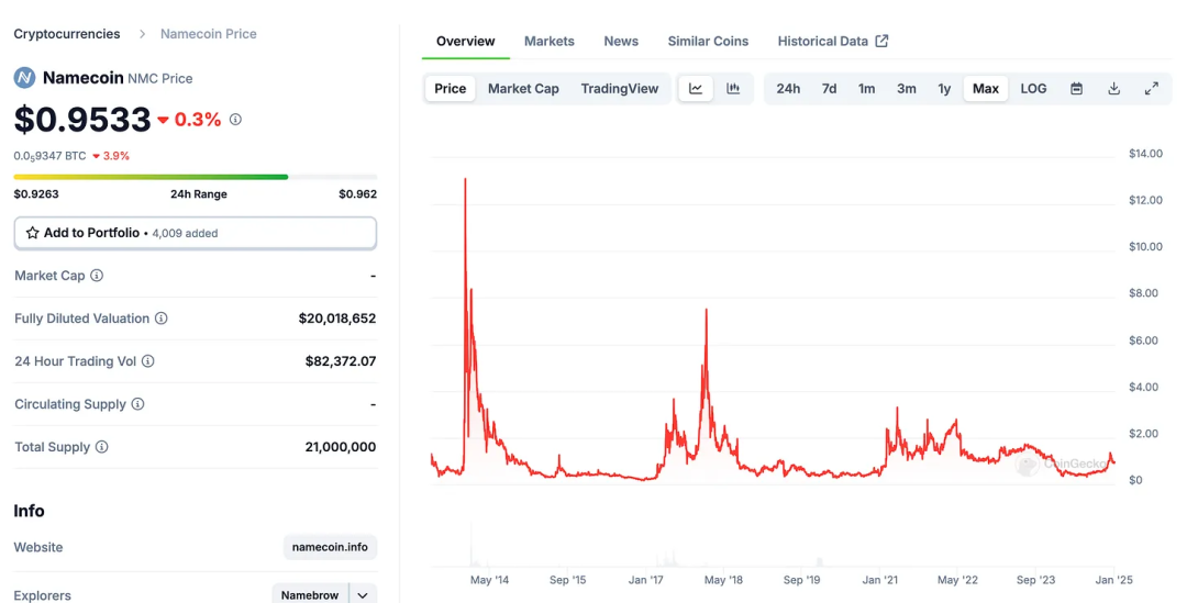 - Namecoin: 旨在创建去**化域名系统,价格一度飙升至约13美元,随后回落。