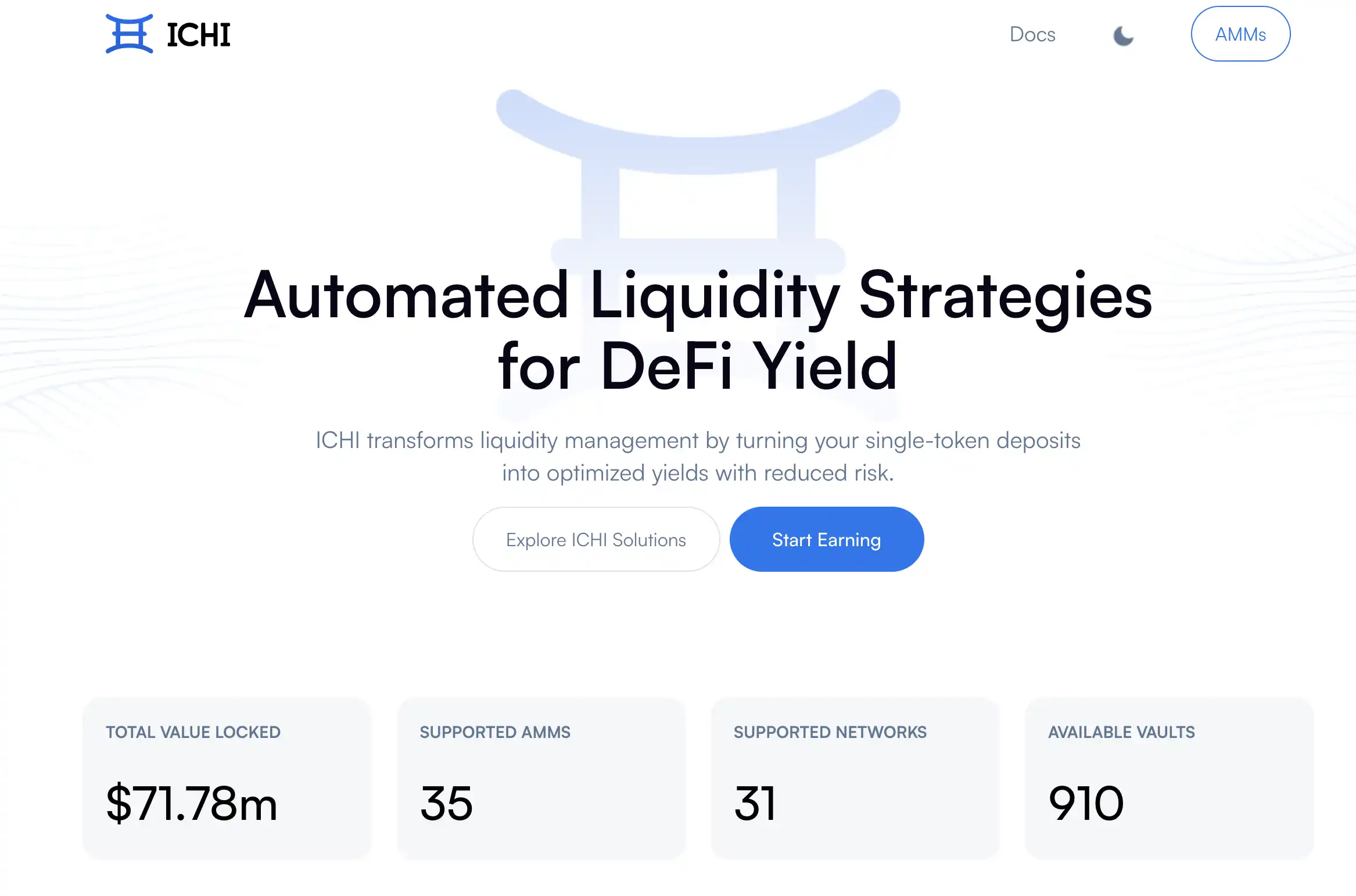 ICHI 是一个非托管 DeFi 协议,简化和优化**项目、DAO、资产管理者和区块链生态系统的流动性管理。通过支持将单**存入集中流动性池,ICHI 实现了 AMM 之间的流动性配置流程自动化。ICHI 的自动化金库目的是支持**发行、维持价格稳定并持续提升流动性深度,同时**流动性提供者的无常损失风险。