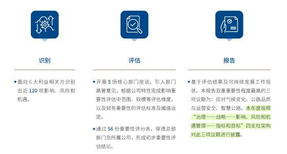 “治理响应”的ESG报告,因为思路清晰而变得更加简洁易读。例如下图为招商公路对于双重重要性分析流程的简介,它实际上预告了整个报告的三个看点,显得直观而坦诚(绿色标注为笔者后加。企业战略,是在有限资源下做出取舍,集中力量去做重要的事,这一常识也适用于ESG规则当中的“战略”。