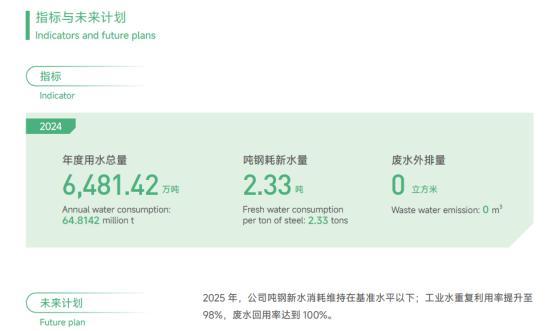 2024年度A股的ESG信披当中,还有一个比较新的现象:一些推进到这一步的企业还做不到制定目标,于是退而求其次,坦率地说了自己的“未来计划”。如下图为河钢股份在用水方面的指标与未来计划。