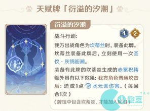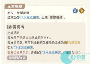 装备有此牌的坎蒂丝生成的赤冕祝祷额外具有以下效果:我方角色普通攻击后:造成1点)水元素伤害。(每回合1次);