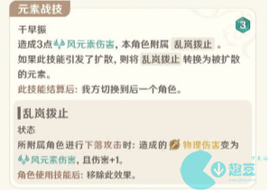 造成3点风元素伤害,本角色附属乱岚拨止。如果此技能引发了扩散,则将乱岚拨止转换为被扩散的元素。